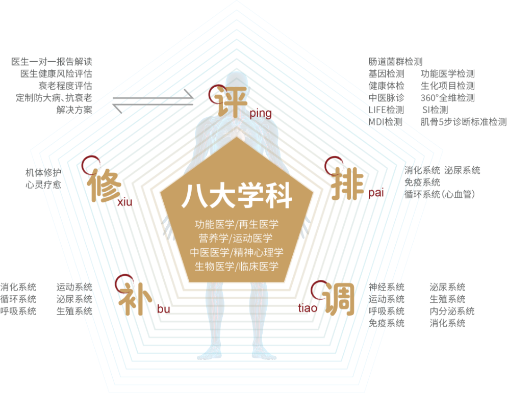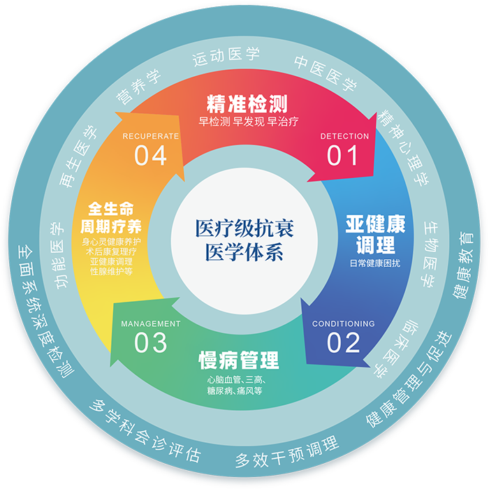 集国内外技术资源,结合功能医学、再生医学、营养学、运动医学、中医医学、精神心理学、生物医学、临床医学八大学科的科学和智慧。建立了“评、排、调、补、修”五维一体的健康管理体系,即“全面系统深度检测、多学科会诊评估、多效干预调理、健康管理与促进、健康教育”的健康医学管理体系。以“健康管理体系为依托,以专业保健团队为核心”,融合全球健康医疗精髓,应用当今生命科学成果,搭建了抗衰老健康管理服务生态圈,为国人健康保驾护航。积极推广健康医学成熟理念与先进技术,促进国人健康、提高国人生命品质,为“健康中国”助力。